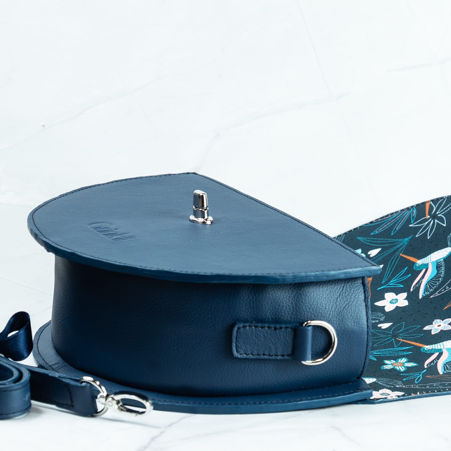 Marhabörből készült crossbody oldaltáska. Bélése kolibri mintás gyöngyvászonból készült és van benne egy kis zseb az apróságoknak. Vállpántja pisztolygombbal állítható. Két végén karabíner található így könnyen levehető. Tökéletes választás hétköznapokra és alkalmakra egyaránt. Vállpánt max. hossza: 120 cm