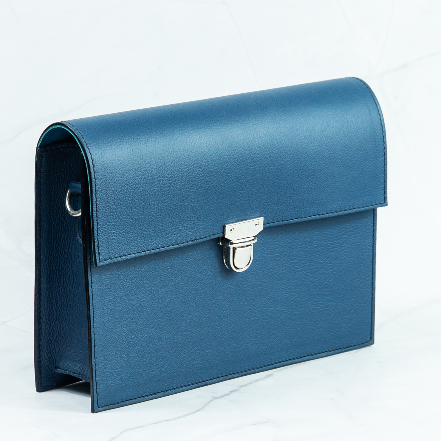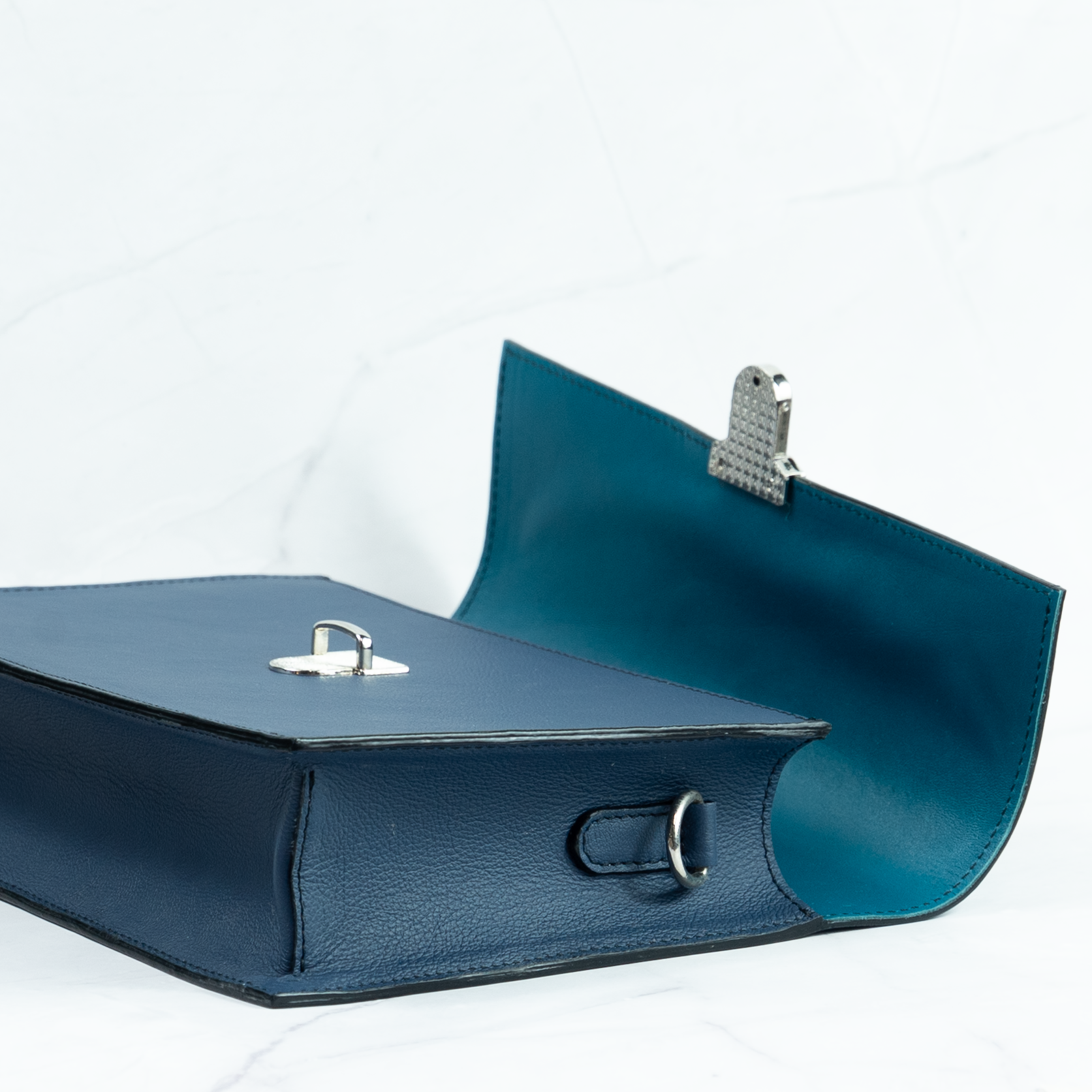 Sötétkék marhabőrből készült crossbody táska. Bélése türkizkék kecskebőrből készült. Vállpántja pisztolygombbal állítható, két végén karabinerrel, így akár le is vehető vagy cserélhető. Tökéletes választás hétköznapokra vagy alkalmakra.