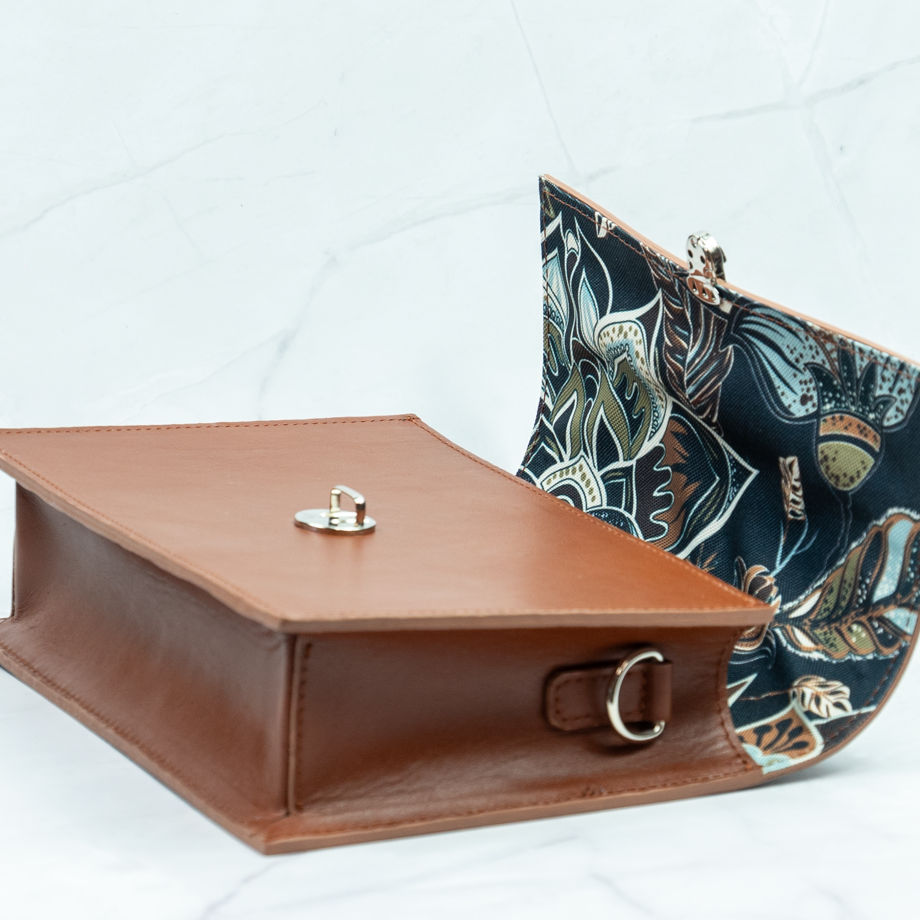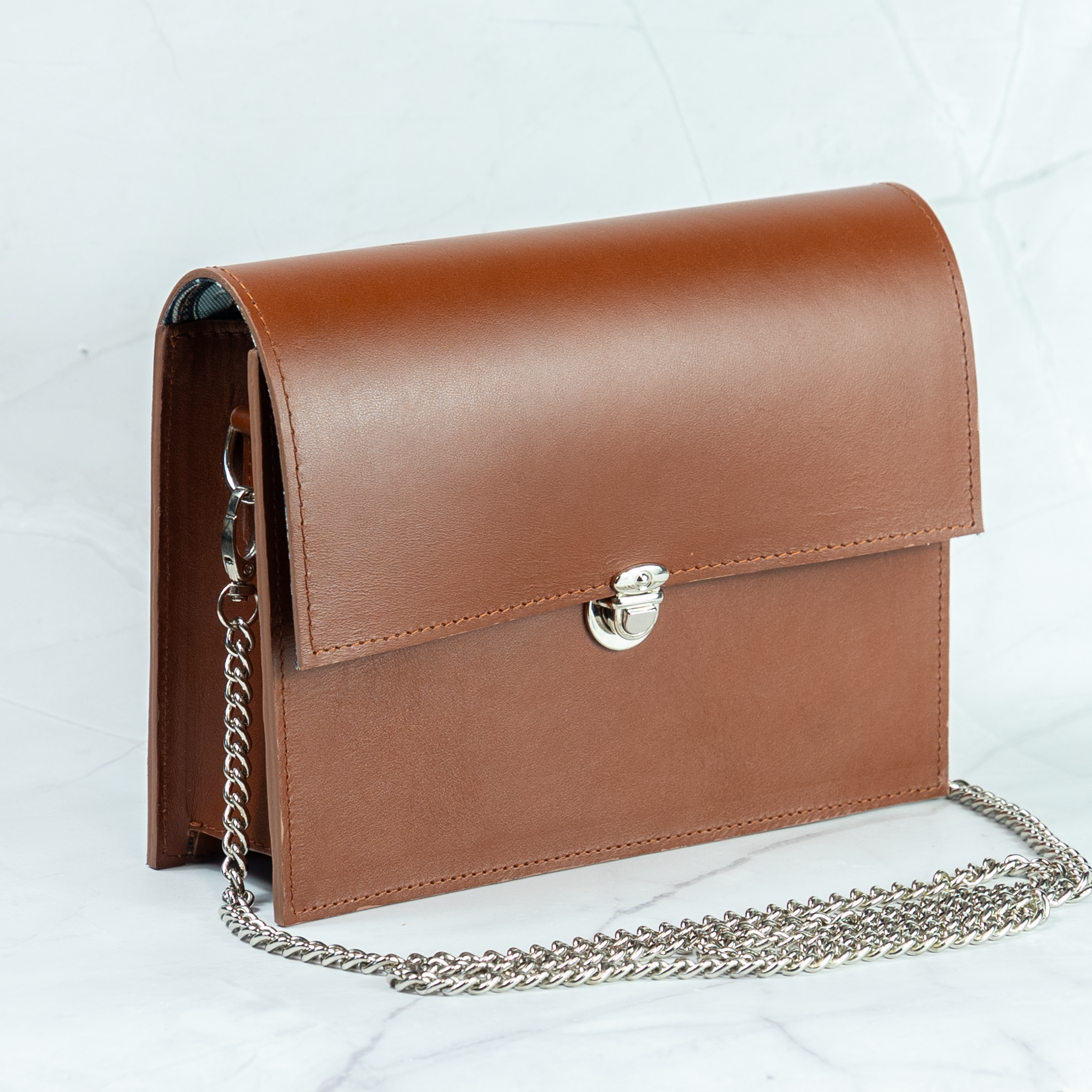 Csokoládébarna marhabőrből készült crossbody táska. Bélése mintás gyöngyvászonból készült és található benne egy kis zseb. Vállpántja nikkel láncból készült, két végén karabinerrel, így akár le is vehető vagy cserélhető. Hossza 120 cm. Tökéletes választás hétköznapokra vagy alkalmakra.