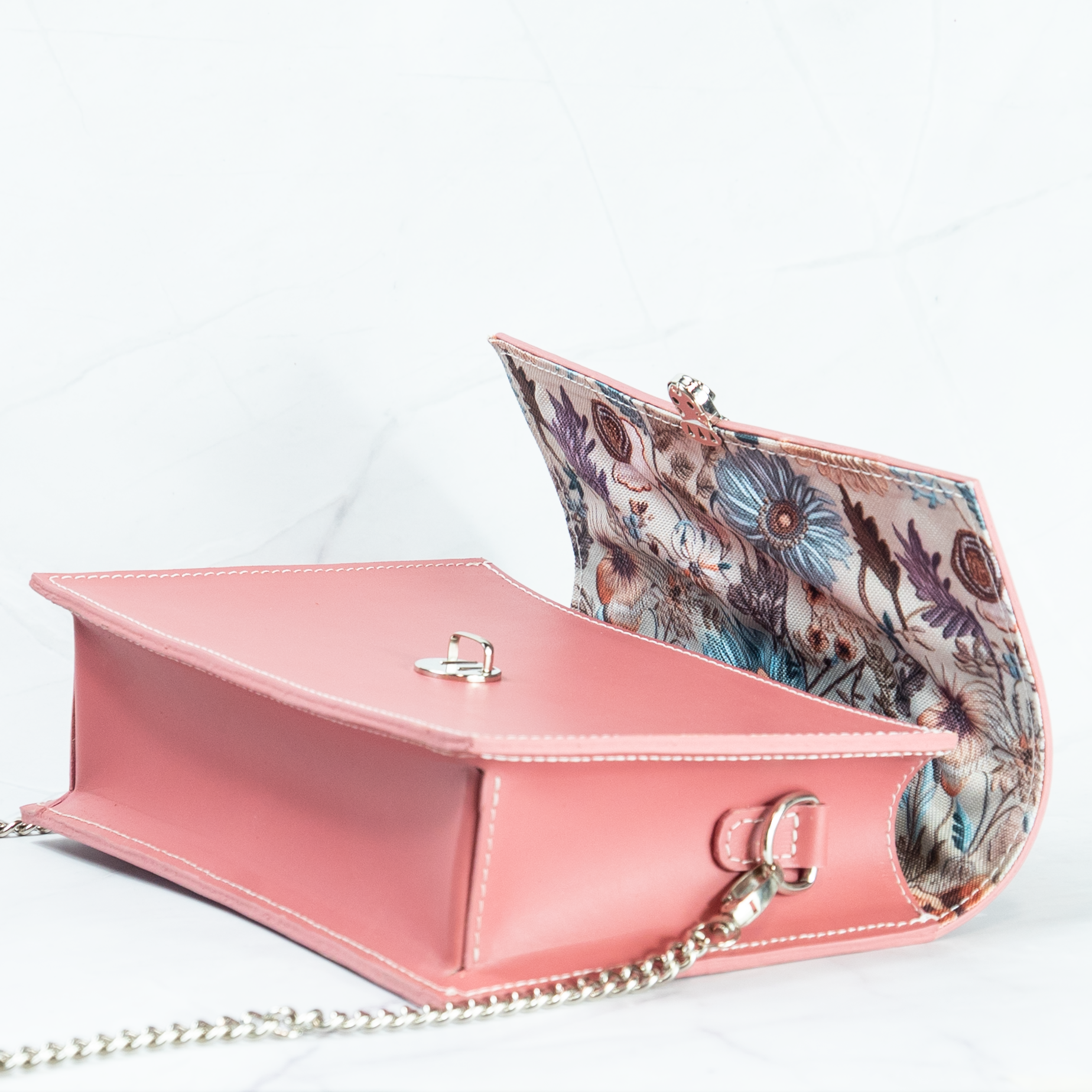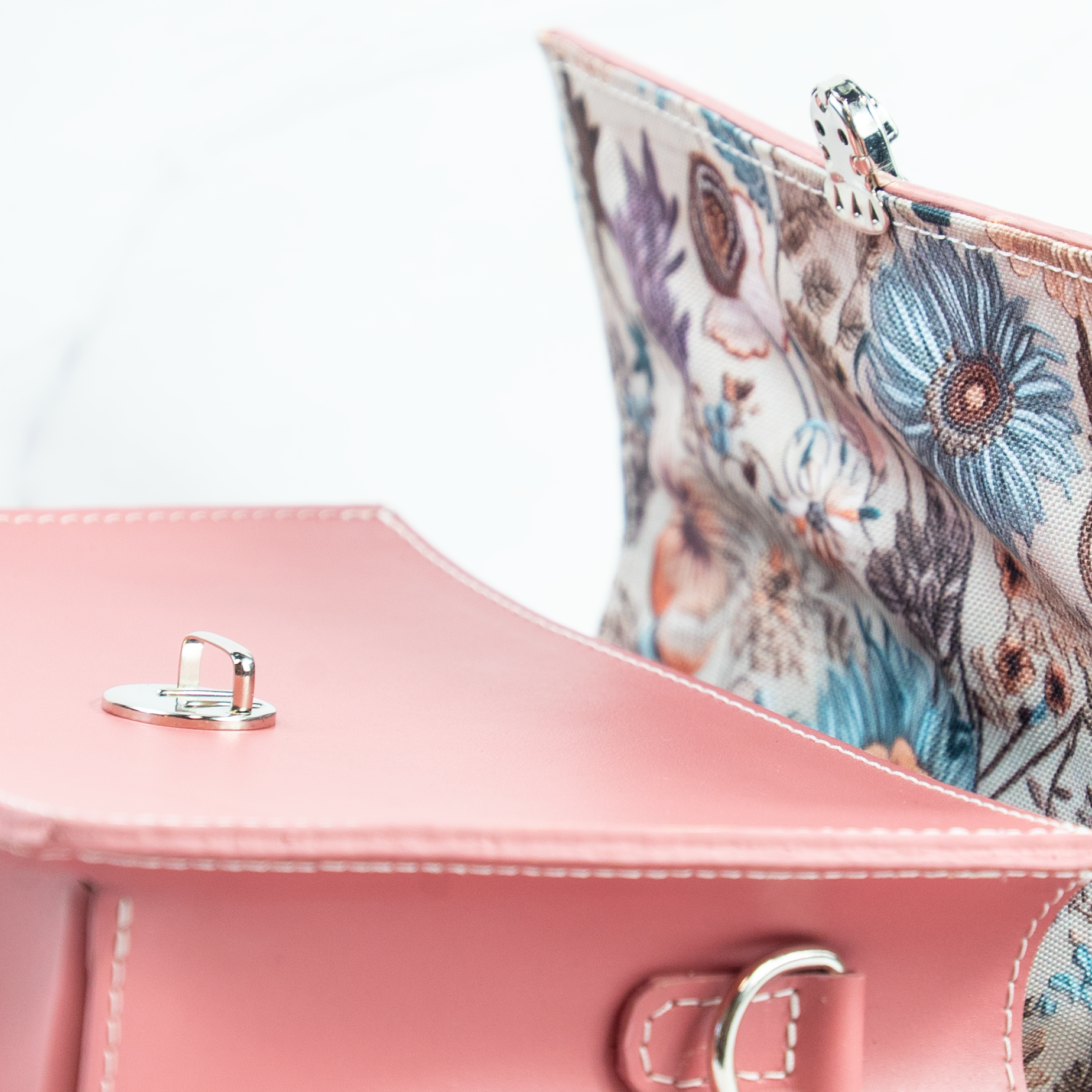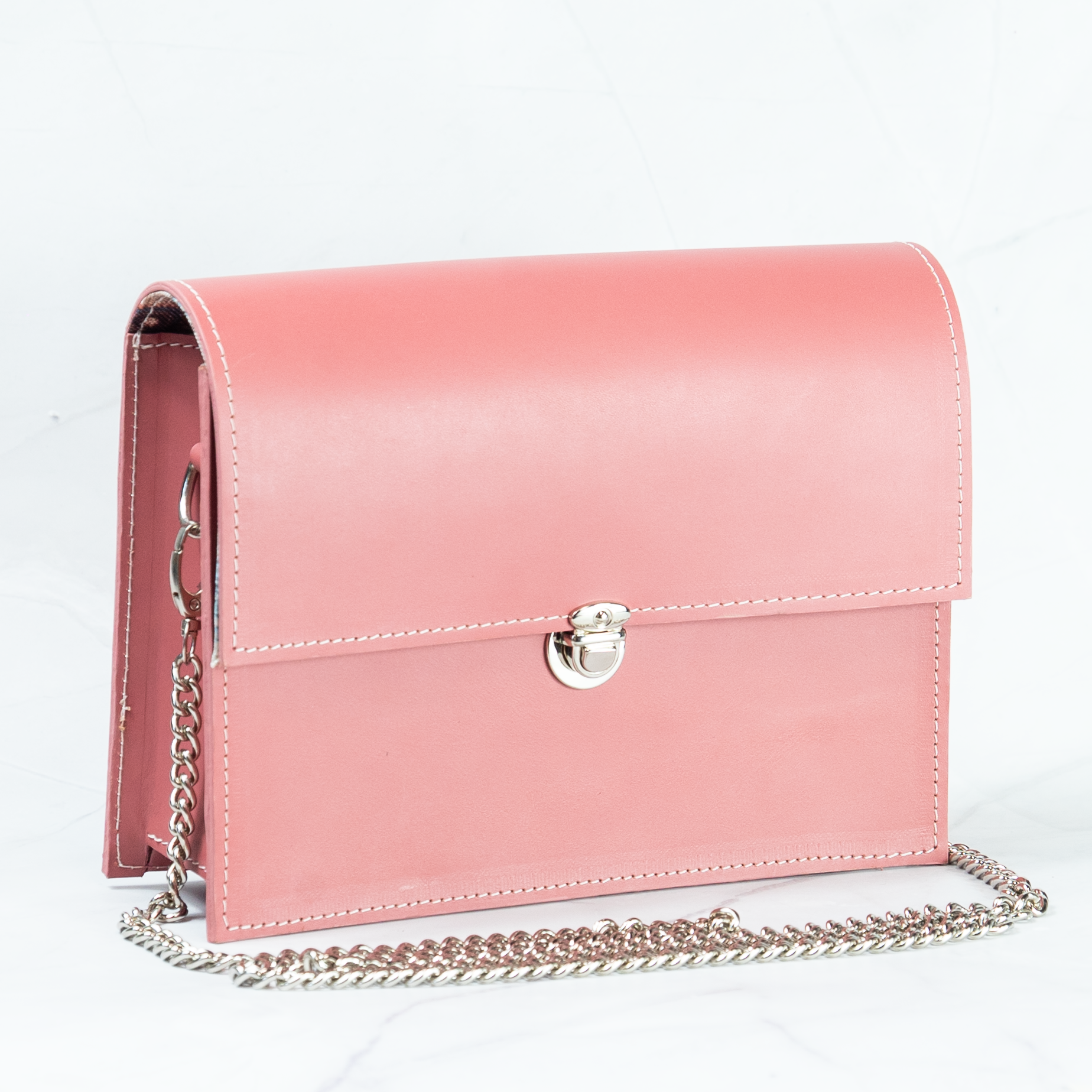 Mályva színű marhabőrből készült crossbody táska. Bélése virágmintás gyöngyvászonból készült és található benne egy kis zseb. Vállpántja nikkel láncból készült, két végén karabinerrel, így akár le is vehető vagy cserélhető. Hossza 120 cm. Tökéletes választás hétköznapokra vagy alkalmakra.